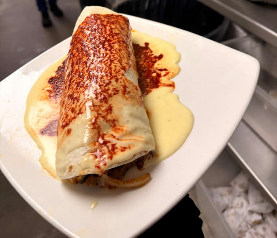 A giant burrito filled with grilled chicken, steak, (or mixed) with grilled bell peppers, onions, tomatoes, beans and rice topped with cheese and ranchero sauce.