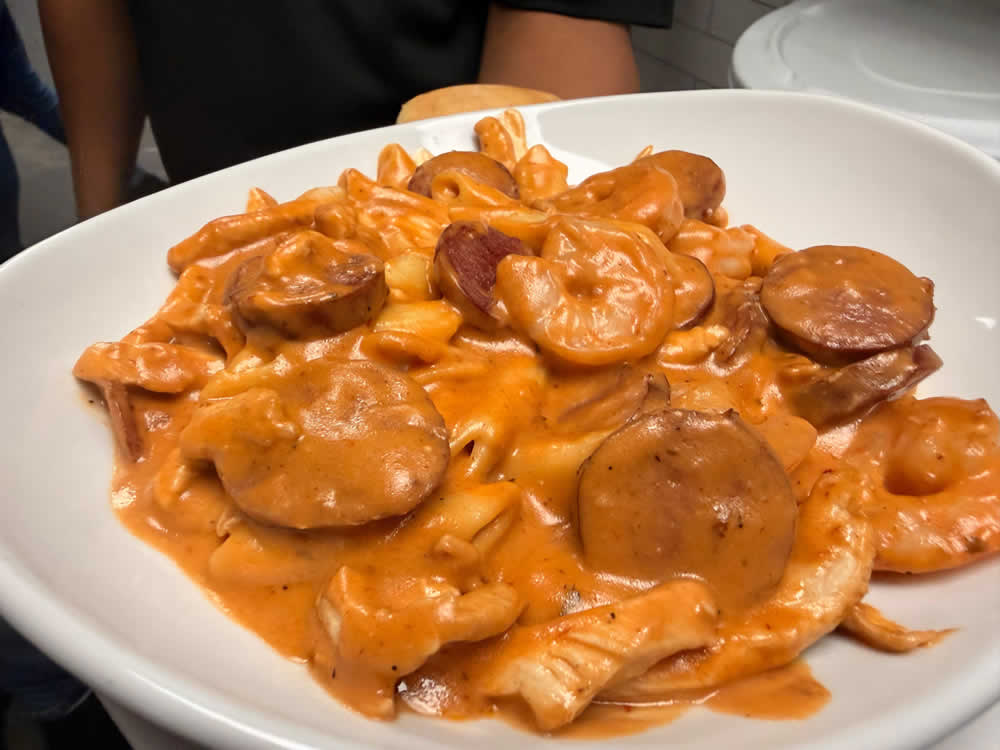 Chicken, sausage and shrimp in a cajun alfredo sauce over penne pasta.