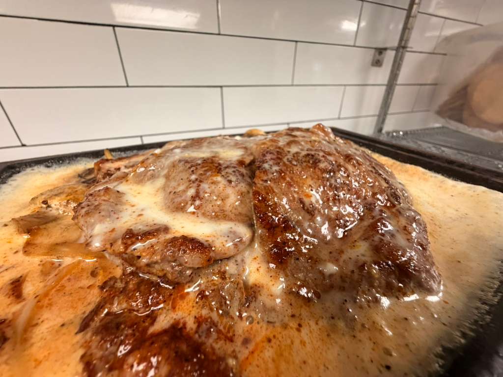 Thin-cut ribeye steak on a sizzling platter with sautéed mushrooms and grill onions topped with cheese sauce served with rice and beans.