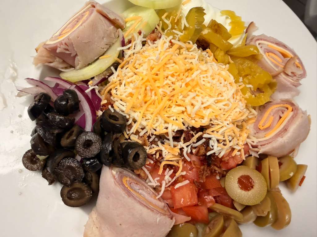 Loaded with ham, turkey, cheese, bacon, egg, cucumbers, onions, black and green olives, tomatoes and banana peppers on a bed of romaine lettuce.