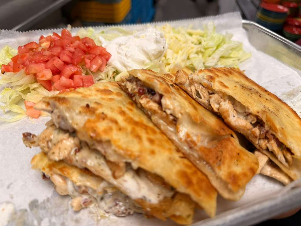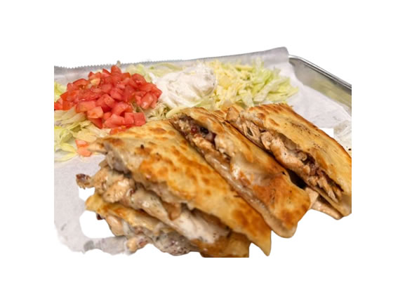 A large flour tortilla grilled and filled with shredded cheese, grilled chicken, ranch seasoning and diced bacon served with sour cream salad.