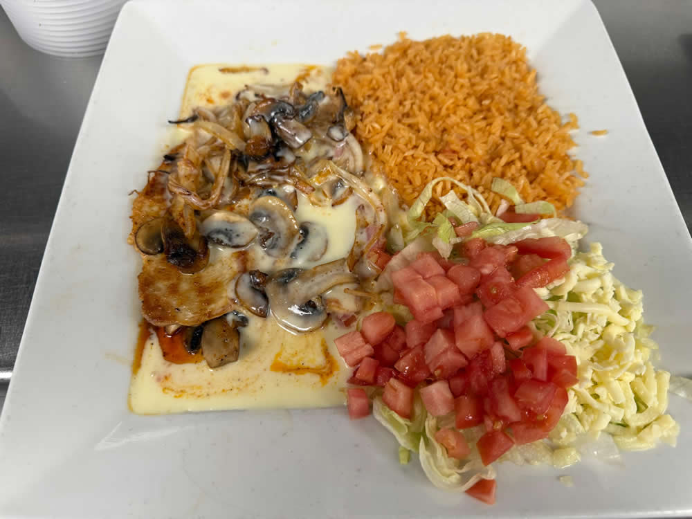 12 oz Grilled Chicken breasts topped with sautéed mushrooms, grilled onions, and cheese sauce served with rice and tossed salad.