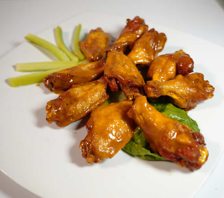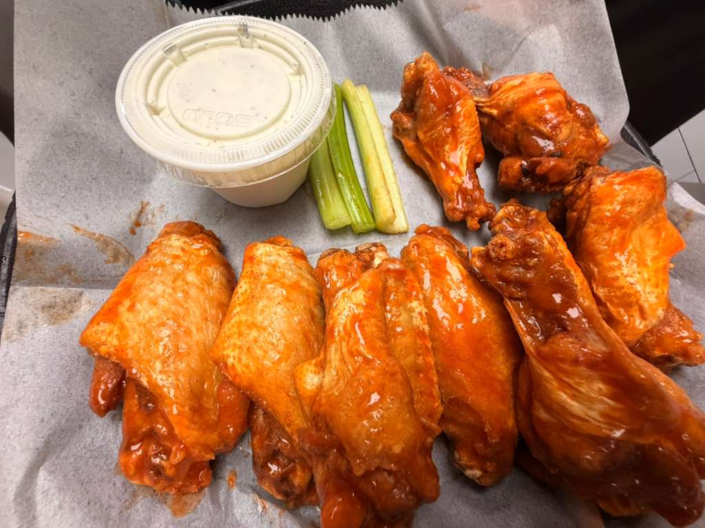 Ten fried wings tossed with your choice of buffalo sauce, lemon pepper, fuego sauce (EXTRA HOT), honey sweet chili, BBQ, tangy gold, mango habanero, umami, or garlic parmesan sauce served with ranch dressing.