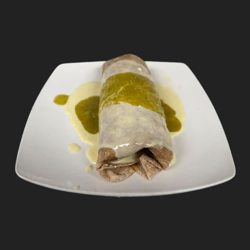 12 inch wheat tortilla filled with carnitas, grilled onions and chorizo. Topped with salsa verde and cheese sauce served with rice and beans