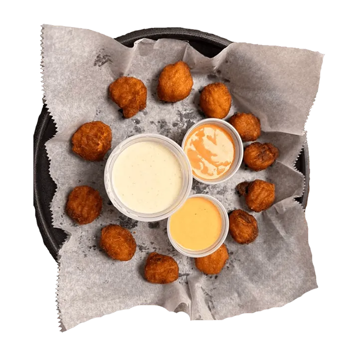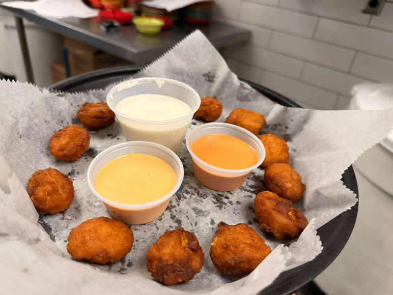Roasted corn nuggets with cheddar, pepper jack, cotija and queso fresco cheeses, deep fried and served with wine and cheese dressing.