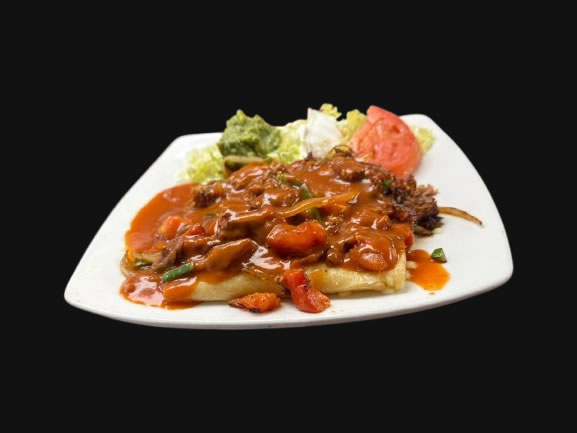 4 cheese enchiladas topped with carnitas, grilled peppers onions, ranchero sauce and sour cream, served with rice and beans.