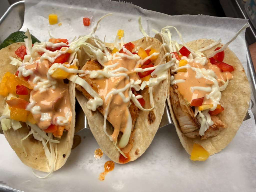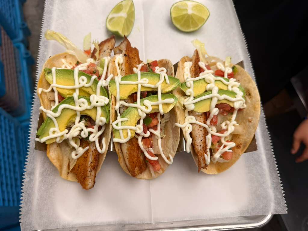 Three flour or corn tortillas filled with your choice of grilled, blackened or fried tilapia served with lettuce, avocados, pico de gallo, mayo, rice and beans .