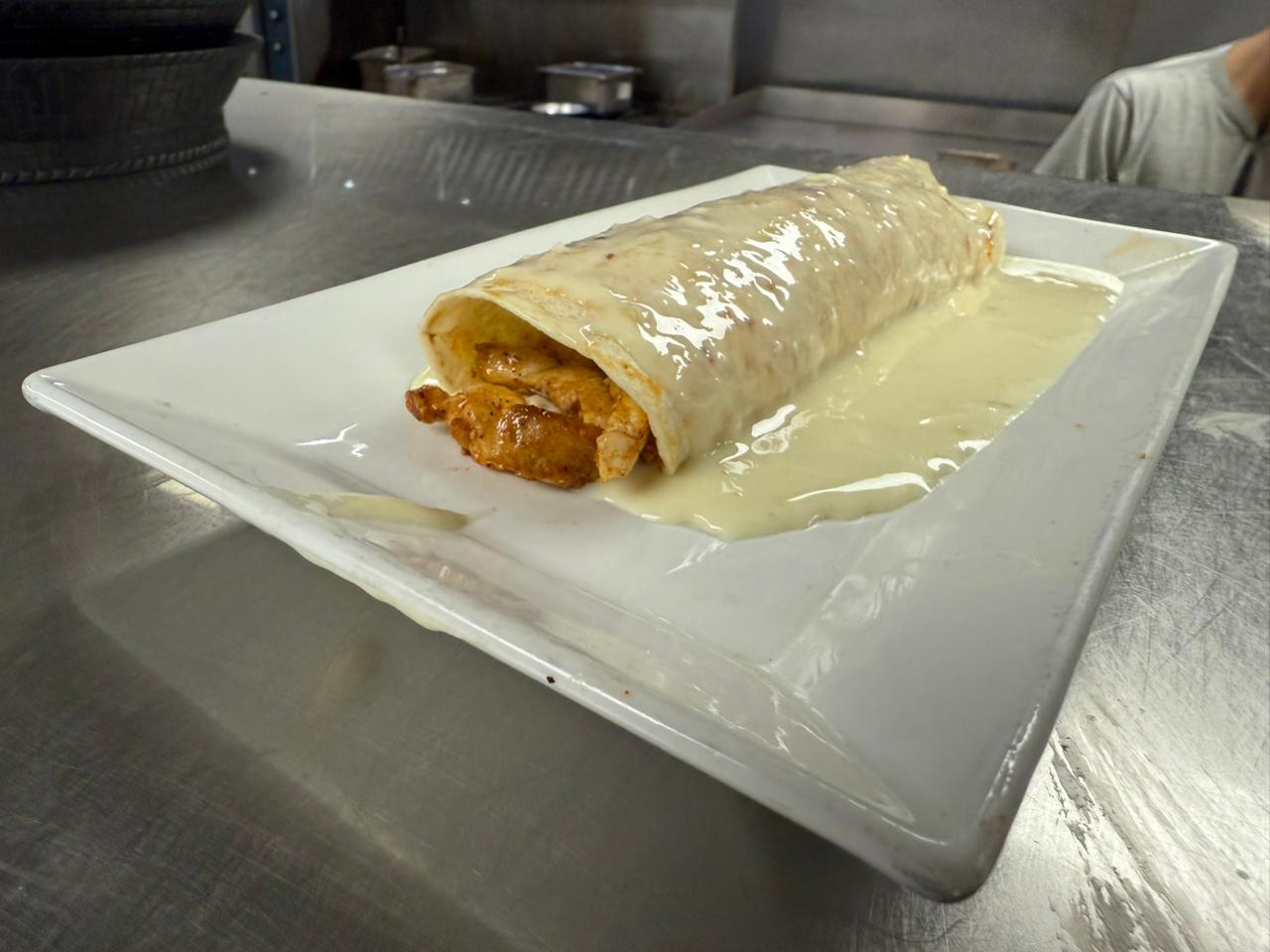 Choice of grilled steak or chicken (or mixed) with cheese sauce.