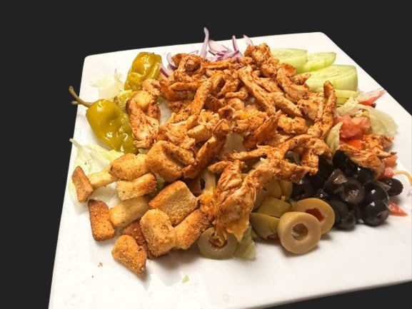 Grilled chicken served over a bed of iceberg lettuce with black olives, green olives, red onions, tomatoes, cucumber, banana peppers, croutons and shredded cheese.