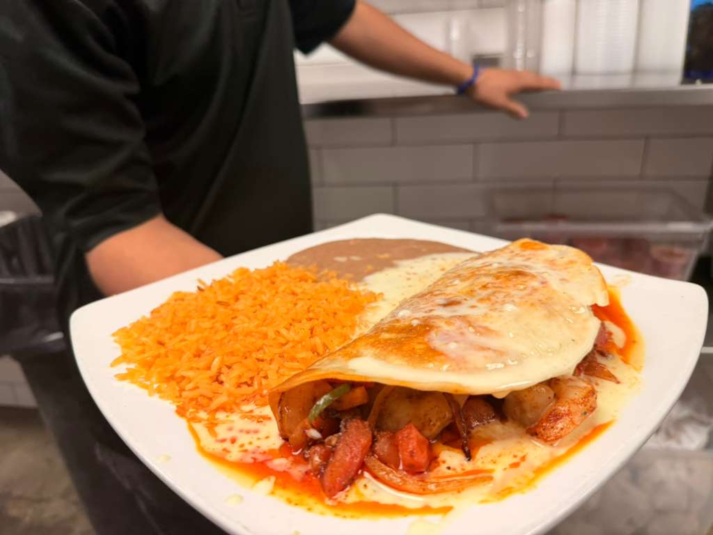 A flour tortilla filled with shrimp, chorizo, onions, bell peppers, tomatoes, cheese, served with rice and beans.