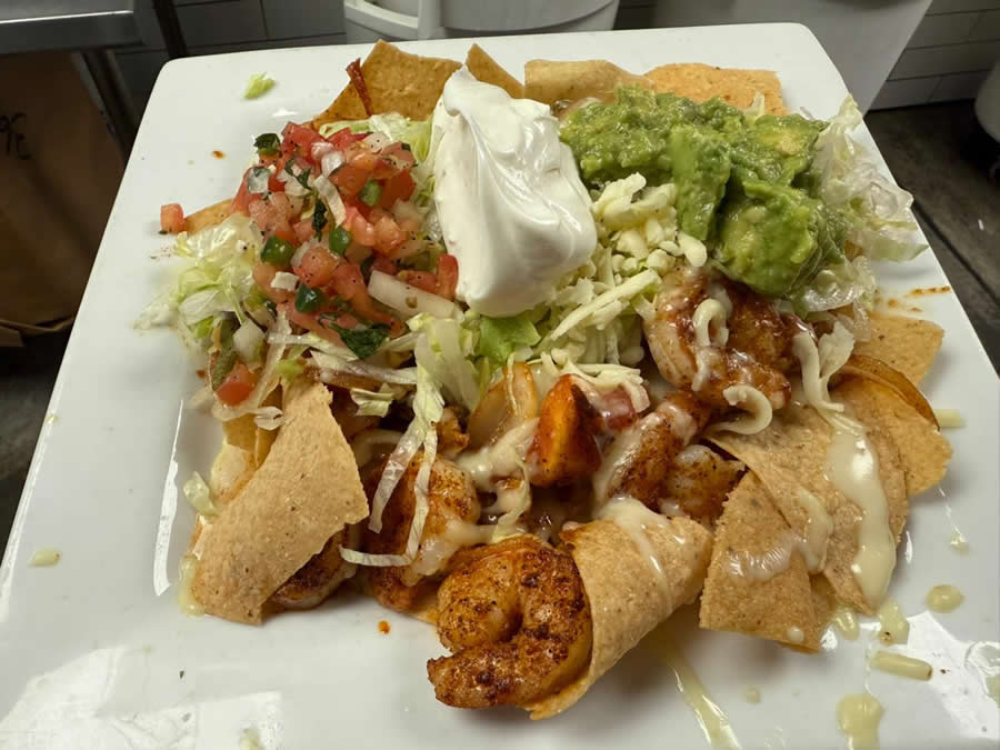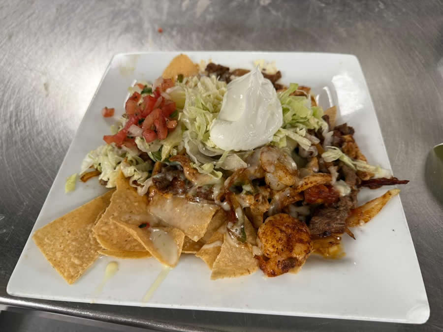Nachos with chicken, steak, shrimp, grilled tomatoes, onions, bell peppers topped with shredded lettuce, sour cream, guacamole and pico de gallo.