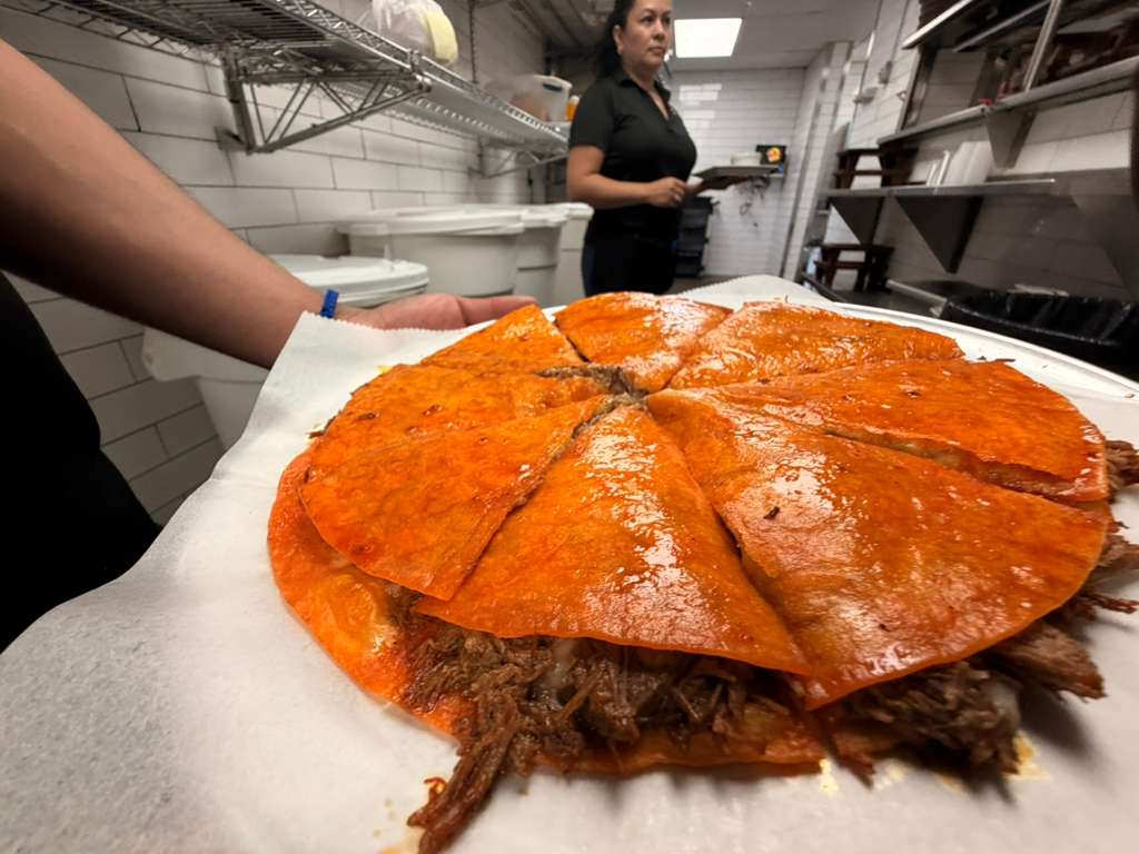 A large Birria style pizza served with consommé soup topped with cilantro, onions and lime.