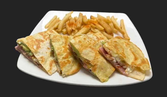 A traditional Mexican Style dish in a toasted flour tortilla filled with ham, cheese, lettuce, avocados, tomatoes, onions, jalapenos, mayonnaise and ketchup served with fries.