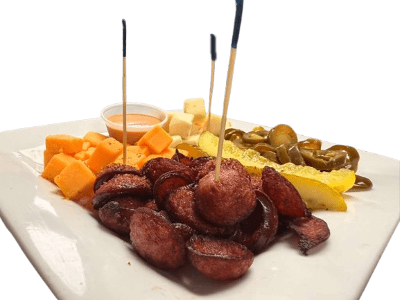 Smoked Sausage, pepper jack and cheddar cheese, jalapenos and pickle spears