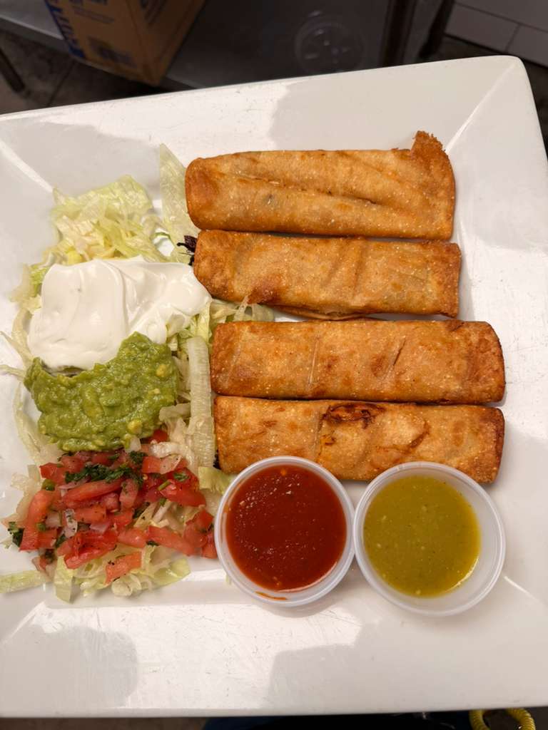 Four shredded chicken taquitos served with lettuce, guacamole, sour cream and pico de gallo with a cup of salsa verde.
