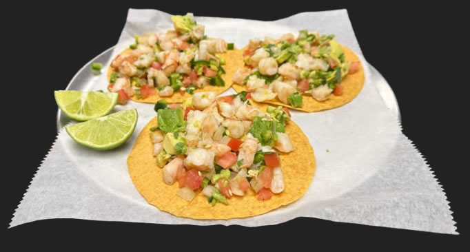 3 fried tostadas topped with ceviche style shrimp mixed with pico de gallo, avocado and lime.